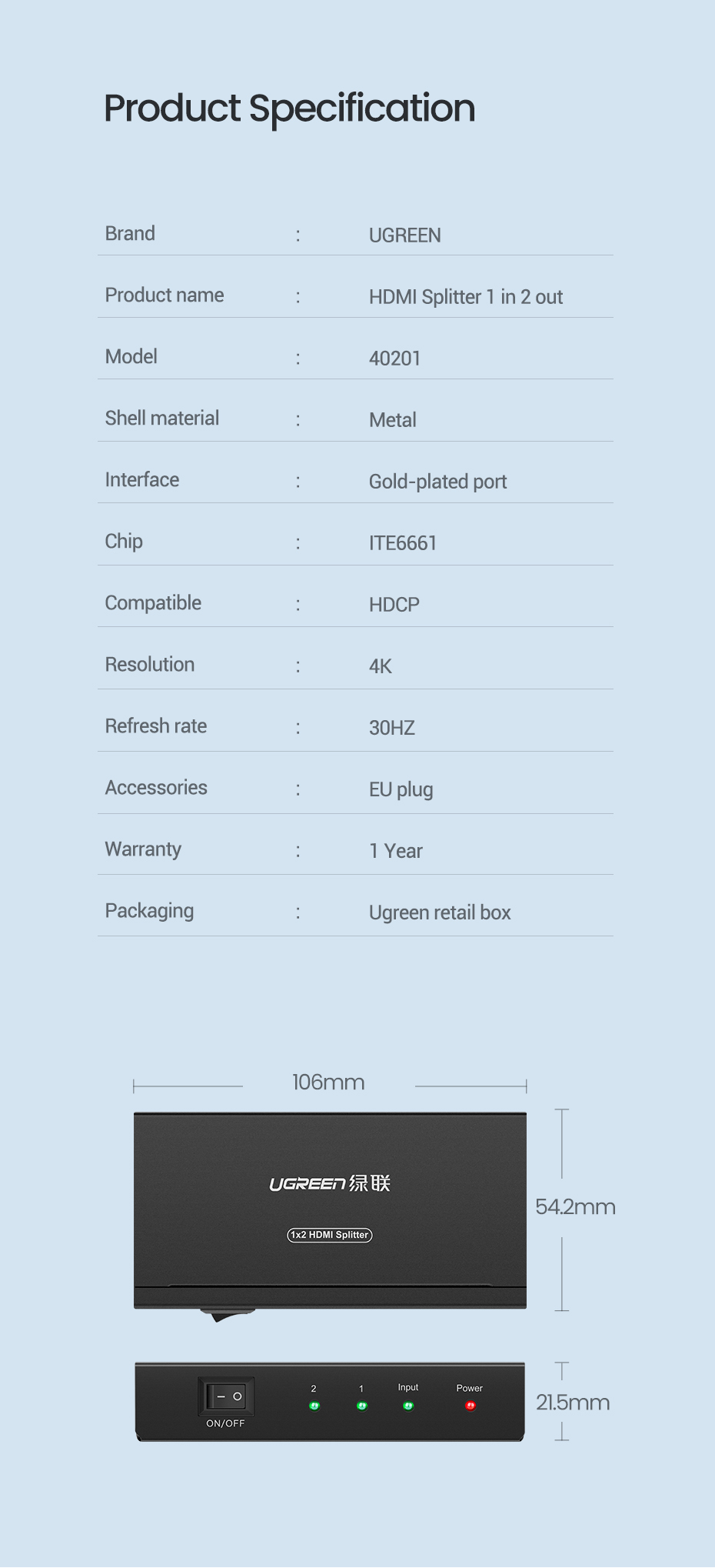 Bộ chia HDMI chính hãng Ugreen (40201, 40202, 40203) là giải pháp tối ưu để chia tín hiệu HDMI từ một nguồn phát ra nhiều màn hình, đảm bảo hiển thị cùng một nội dung với chất lượng hình ảnh sắc nét lên đến 4K@30Hz. Thiết bị có thiết kế cao cấp, hỗ trợ đa dạng số cổng chia (1 ra 2, 1 ra 4, 1 ra 8), phù hợp cho các nhu cầu trình chiếu tại hội họp, giảng dạy, giải trí hoặc triển lãm. Đây là sản phẩm lý tưởng mang lại hiệu suất cao và sự tiện lợi cho mọi hệ thống kết nối đa màn hình.