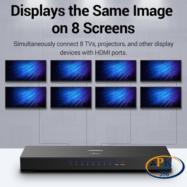 Bộ chia HDMI 1 ra 8 Ugreen 40203 giúp kết nối một thiết bị HDMI với 8 màn hình cùng lúc, hỗ trợ độ phân giải 4K@30Hz và âm thanh 3D. Sản phẩm lý tưởng cho hội nghị, sự kiện, giải trí gia đình, và các hệ thống truyền hình chuyên dụng, đảm bảo chất lượng hình ảnh và âm thanh vượt trội.