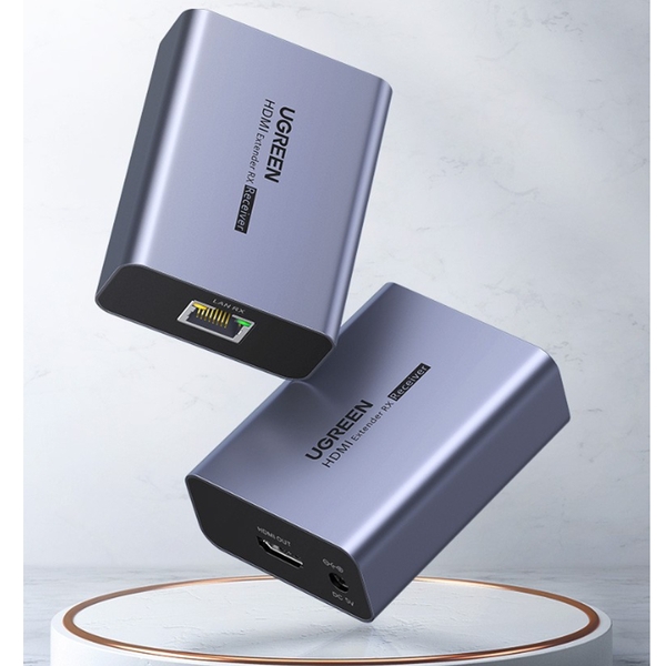 Bộ kéo dài HDMI Ugreen 20519 bao gồm một đầu phát (Sender) và một đầu nhận (Receiver), kết nối qua cáp mạng cat5e/6 với chiều dài tối đa 70m. Giải pháp này giúp tiết kiệm chi phí thi công, bảo trì khi đi dây âm tường hoặc kết nối khoảng cách xa.