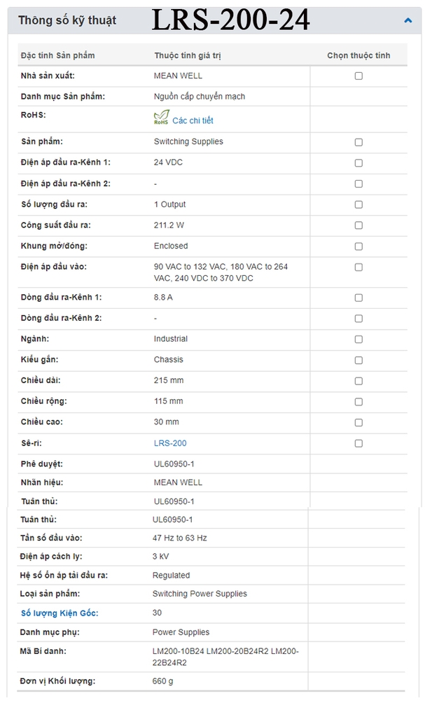 Bộ nguồn LED MeanWell LRS-200-24 24V-200W hiệu quả, đáng tin cậy cho chiếu sáng LED. Thiết kế nhỏ gọn, hiệu suất cao (82%), bảo vệ toàn diện (ngắn mạch, quá áp, quá tải, quá nhiệt). Điện áp vào: 85~264VAC, 120~370VDC; Điện áp ra: 24V; Dòng điện ra: 8.8A; Công suất: 200W. Kích thước: 115x215x30mm. Ứng dụng: chiếu sáng dân dụng, thương mại, công nghiệp.