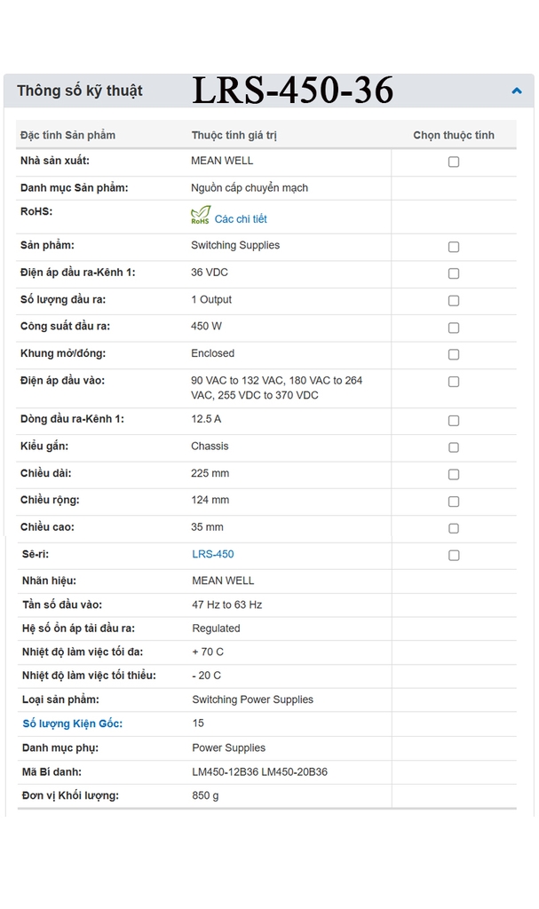 Bộ nguồn LED MeanWell LRS-450-36 36V-450W hiệu quả, đáng tin cậy cho chiếu sáng LED. Thiết kế nhỏ gọn, hiệu suất cao (82%), bảo vệ toàn diện (ngắn mạch, quá áp, quá tải, quá nhiệt). Điện áp vào: 85~264VAC, 120~370VDC; Điện áp ra: 36V; Dòng điện ra: 12.5A; Công suất: 450W. Kích thước: 124x225x35mm. Ứng dụng: chiếu sáng dân dụng, thương mại, công nghiệp.