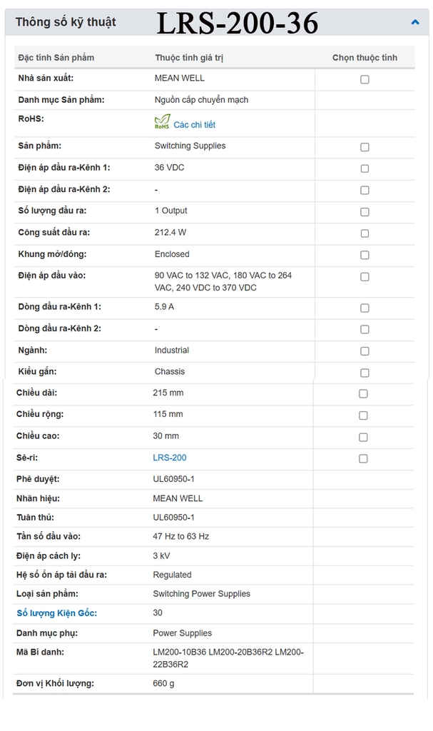 Bộ nguồn LED MeanWell LRS-150-36 36V-150W hiệu quả, đáng tin cậy cho chiếu sáng LED. Thiết kế nhỏ gọn, hiệu suất cao (82%), bảo vệ toàn diện (ngắn mạch, quá áp, quá tải, quá nhiệt). Điện áp vào: 85~264VAC, 120~370VDC; Điện áp ra: 36V; Dòng điện ra: 4.3A; Công suất: 150W. Kích thước: 97x159x30mm. Ứng dụng: chiếu sáng dân dụng, thương mại, công nghiệp.