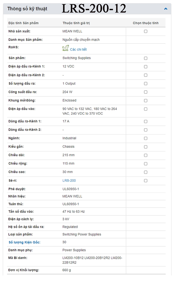 Bộ nguồn LED MeanWell LRS-200-12 12V-17A 200W là giải pháp cung cấp năng lượng hiệu quả và đáng tin cậy cho các ứng dụng chiếu sáng LED. Với thiết kế nhỏ gọn, hiệu suất cao và khả năng bảo vệ toàn diện, sản phẩm này đáp ứng mọi yêu cầu khắt khe của các dự án chiếu sáng hiện đại.