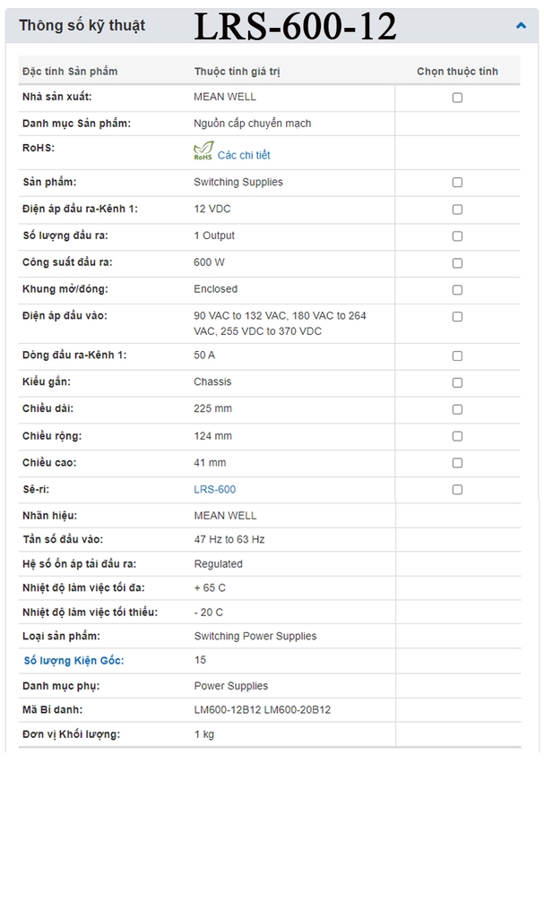 Bộ nguồn LED MeanWell LRS-600-12 12V-50A 600W là sự lựa chọn lý tưởng cho các hệ thống chiếu sáng LED. Với chất lượng vượt trội, tính năng đa dạng và giá cả hợp lý, sản phẩm này sẽ mang đến sự hài lòng tuyệt đối cho khách hàng.![]()