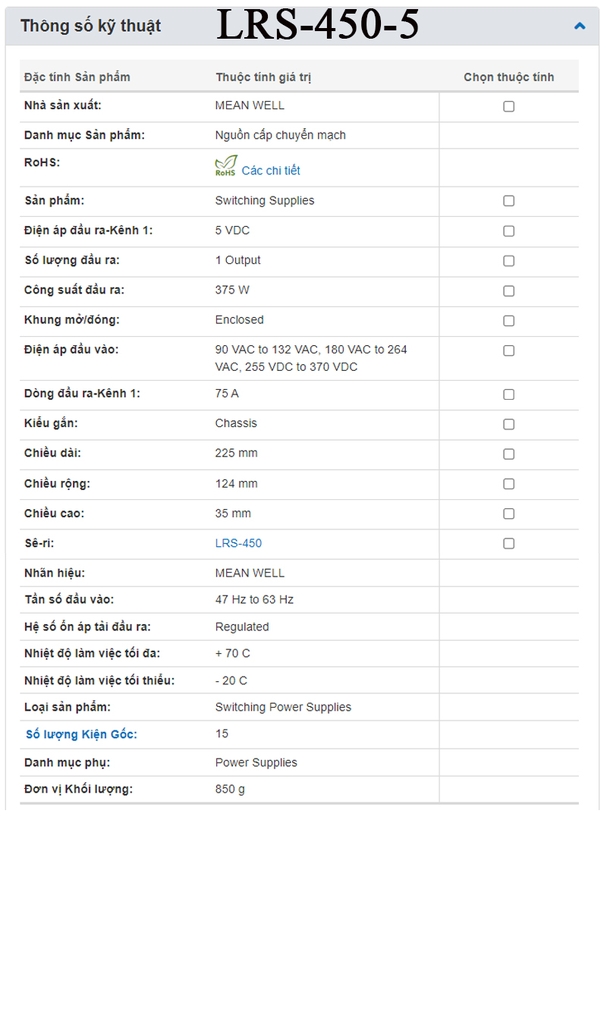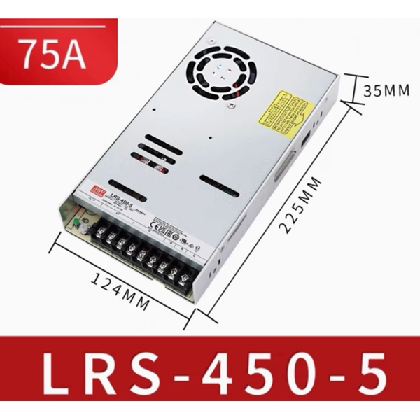 Bộ nguồn LED MeanWell LRS-450-5 5V-450W hiệu quả, đáng tin cậy cho chiếu sáng LED. Thiết kế nhỏ gọn, hiệu suất cao (82%), bảo vệ toàn diện (ngắn mạch, quá áp, quá tải, quá nhiệt). Điện áp vào: 85~264VAC, 120~370VDC; Điện áp ra: 5V; Dòng điện ra: 75A; Công suất: 450W. Kích thước: 124x215x35mm. Ứng dụng: chiếu sáng dân dụng, thương mại, công nghiệp.