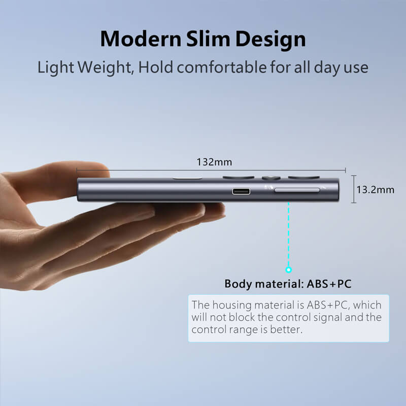 Thiết kế vỏ ABS + PC cao cấp, màu xám kim loại sang trọng, đi kèm túi nhung tiện lợi, phù hợp cho doanh nhân, giáo viên, giảng viên và người thuyết trình chuyên nghiệp.