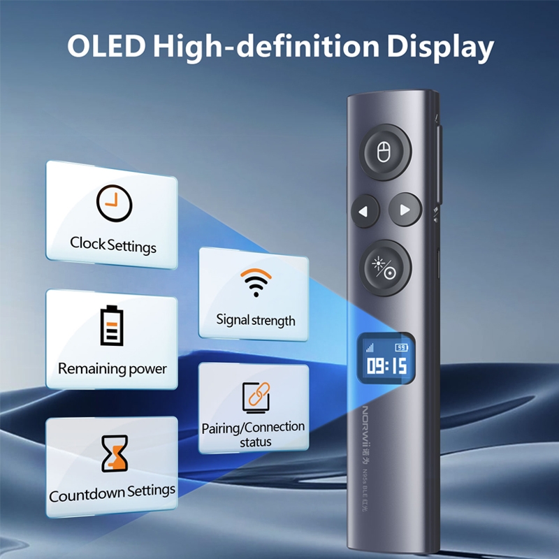 Norwii N95S BLE là bút trình chiếu không dây cao cấp, tích hợp Bluetooth + sóng 2.4G, mang lại khả năng điều khiển linh hoạt và ổn định trong không gian lớn như phòng họp, hội trường, lớp học hoặc sân khấu.