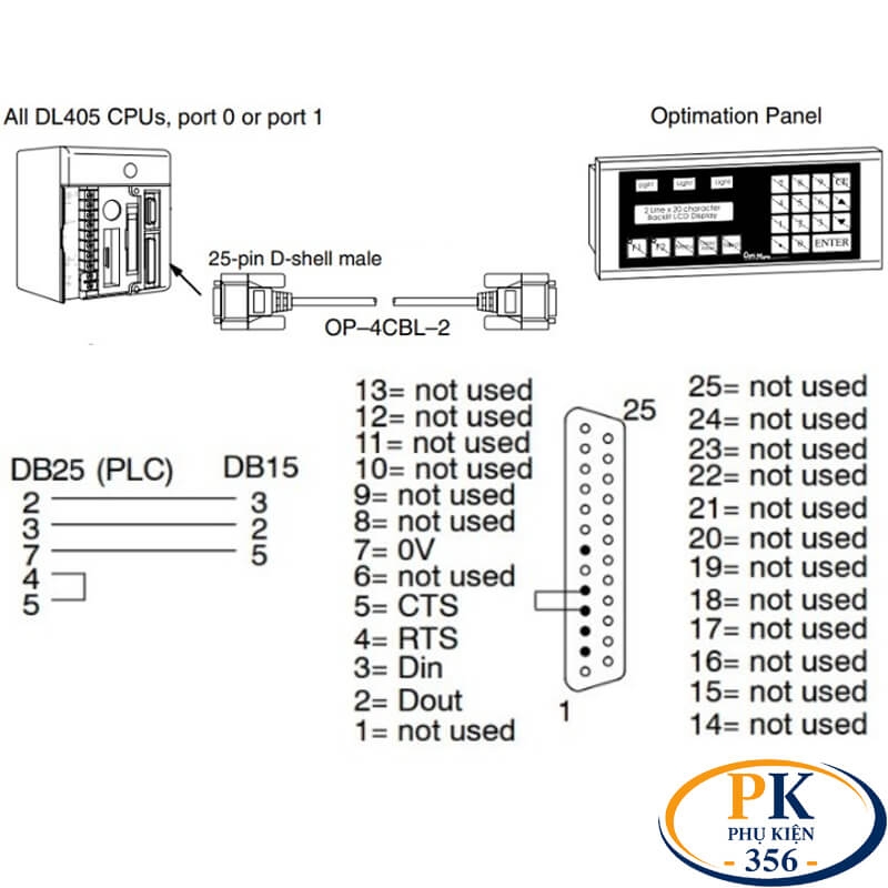 Cáp chuyển DB25 dương sang DB15 dương dùng cho PLC Programming DB25M to DB15M là giải pháp kết nối chuyên dụng giữa PLC KOYO DirectLOGIC 405 và Optimation Panel. Sản phẩm chuẩn RS232C, thiết kế DIY chất lượng cao, hỗ trợ nhiều độ dài từ 1.5M đến 15M, thay thế hoàn hảo cho cáp OP-4CBL-2.