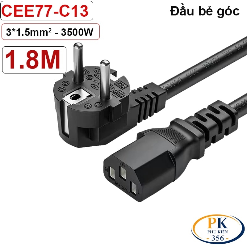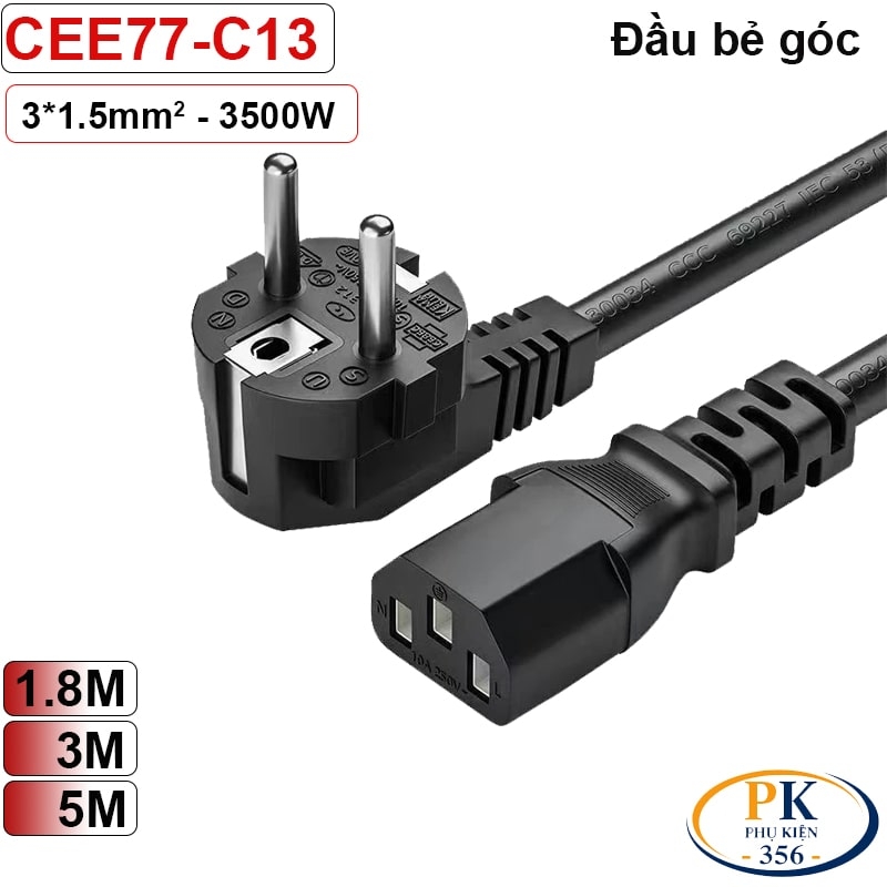 Cáp nguồn C13 EU CEE 7/7 lõi đồng 3x1.5mm² đầu bẻ góc, chiều dài 1.8m, 3m, 5M, 10M đạt chuẩn IEC320 & CE. Phù hợp cấp nguồn cho PC, màn hình, server, UPS, thiết bị văn phòng.