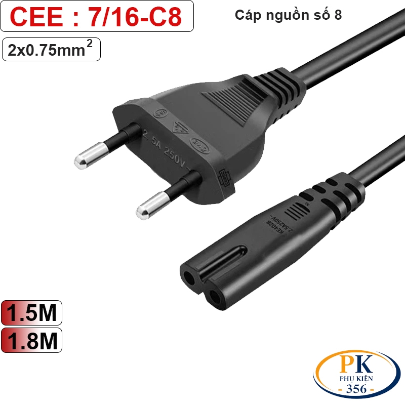 cáp nguồn số 8 C7, dây nguồn IEC C7, cáp nguồn số 8 lõi đồng, dây nguồn C7 2x0.75mm, cáp nguồn adapter số 8, dây nguồn TV loa C7