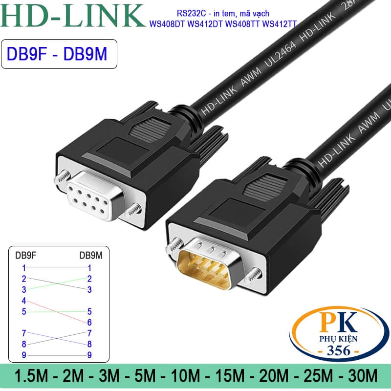 Cáp RS232C DB9 dương sang DB9 âm cho máy In Mã Vạch Tem Nhãn Công Nghiệp WS4 Series Printer WS408DT WS412DT WS408TT WS412TT là cáp giao tiếp chuẩn RS232 đấu chéo (null modem), DIY từ dây 9 lõi đồng HD-Link, đầu DB9M và DB9F chân đồng giúp truyền dữ liệu ổn định, kết nối hiệu quả giữa máy in và máy tính.