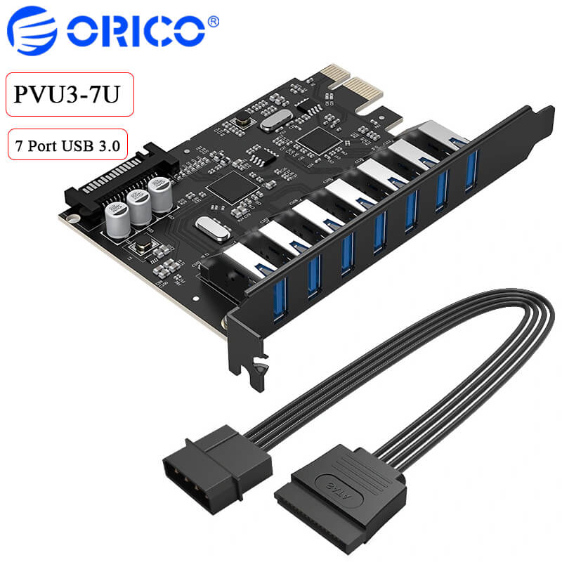 Orico PVU3-7U là card mở rộng PCIe chuyên dụng giúp bổ sung thêm 7 cổng USB 3.0 cho máy tính bàn, giải quyết hiệu quả tình trạng thiếu cổng kết nối khi sử dụng nhiều thiết bị ngoại vi như ổ cứng di động, USB, máy in, bàn phím, chuột, camera, máy quét…