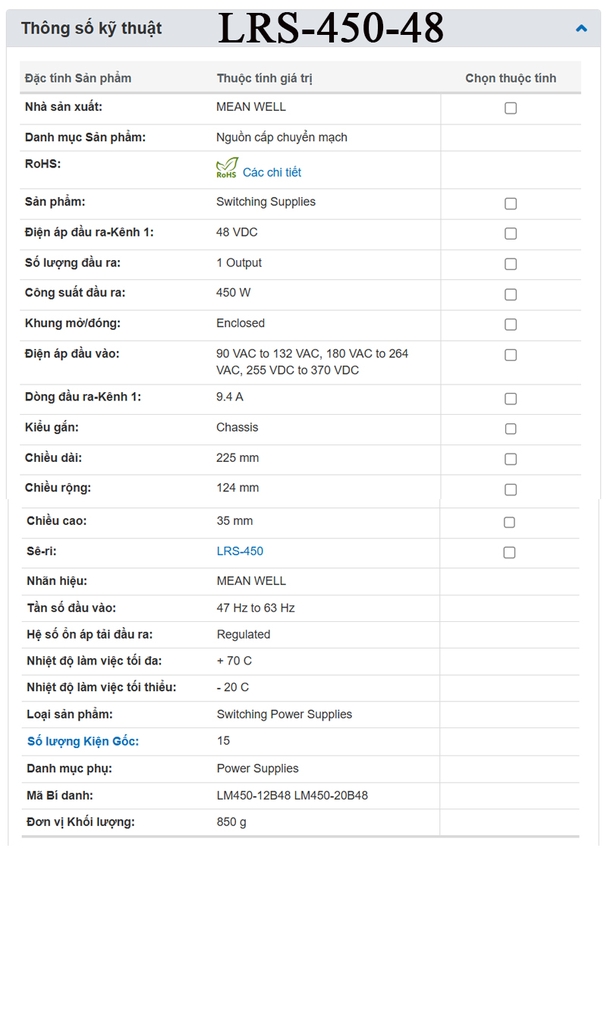 Bộ nguồn LED MeanWell LRS-450-48 48V-9.4A 450W là sự lựa chọn lý tưởng cho các hệ thống chiếu sáng LED. Với chất lượng vượt trội, tính năng đa dạng và giá cả hợp lý, sản phẩm này sẽ mang đến sự hài lòng tuyệt đối cho khách hàng.