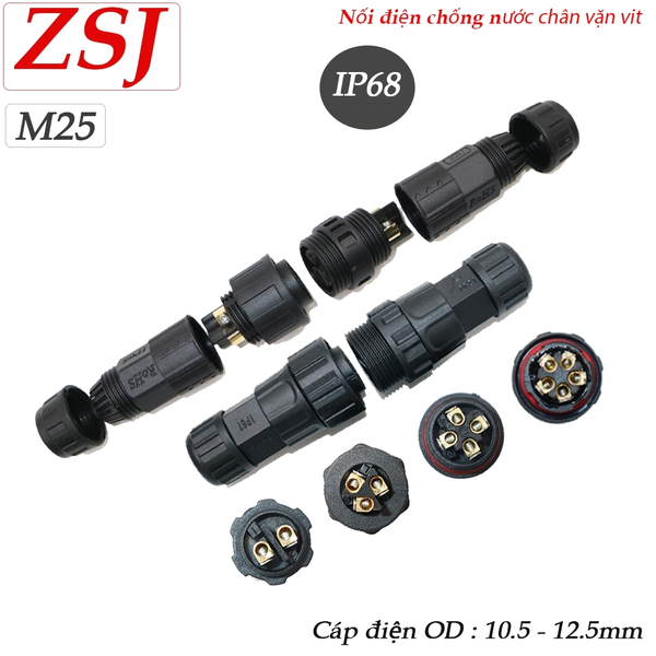 Đầu cút nối dây điện chống nước ZSJ M25 chuẩn IP68, hỗ trợ 2-5 lõi, chịu điện áp 500V, dòng 35A, phù hợp môi trường khắc nghiệt. Ứng dụng trong hệ thống điện nhà máy, khu công nghiệp, công trình ngầm nước, chiếu sáng ngoài trời, và khu vực độ ẩm cao. Lắp đặt dễ dàng, bền bỉ.