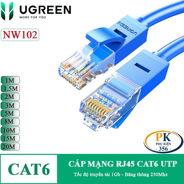 Dây cáp mạng RJ45 CAT6 1Gb 250Mhz Ugreen 15997 NW102 dây tròn màu xanh dài 1.5M hỗ trợ tốc độ 1000Mbps, băng thông 250MHz, đảm bảo kết nối ổn định cho máy tính, router, switch và camera IP. Với lõi nhôm mạ đồng 26AWG, đầu cắm RJ45 mạ vàng và cấu trúc chữ thập chống nhiễu, sản phẩm phù hợp cho gia đình, văn phòng, hệ thống mạng LAN
