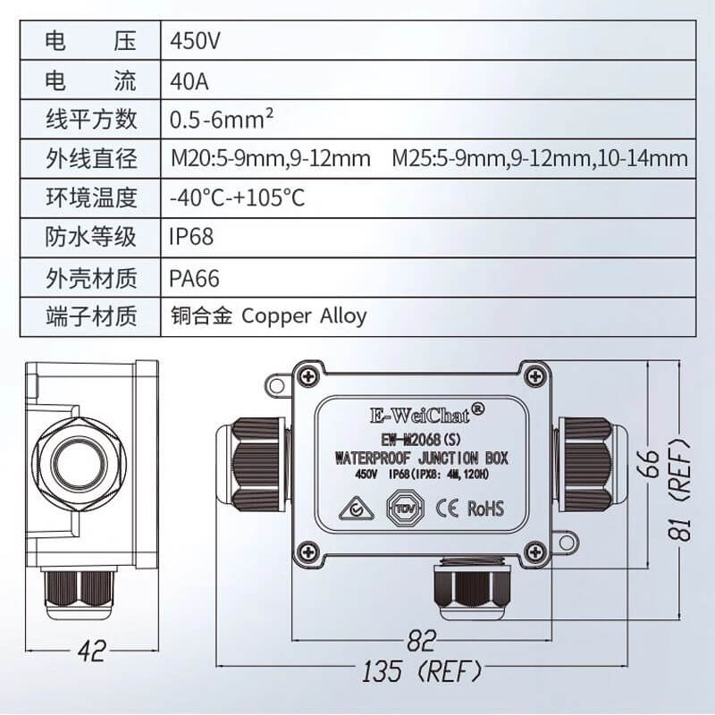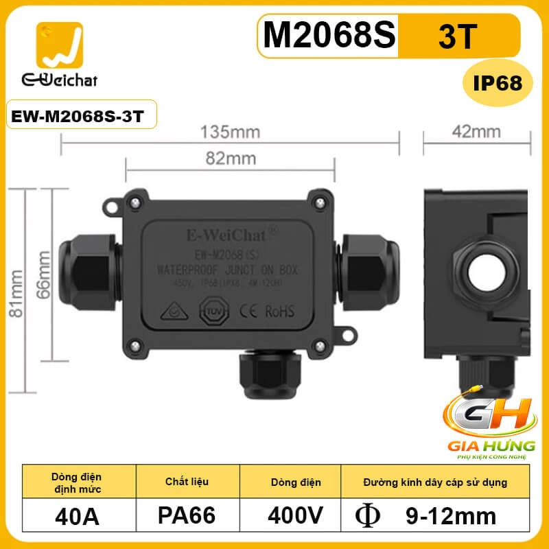 Hộp nối điện chống nước IP68 E-Weichat EW-M2068S-3T là giải pháp kết nối và chia 2,3,4 nhánh dây điện an toàn cho môi trường ngoài trời. Sản phẩm sử dụng nhựa PA66 cao cấp, chịu tải lên đến 40A – 450V, hỗ trợ nhiều đường kính cáp, phù hợp cho hệ thống điện dân dụng và công nghiệp.
