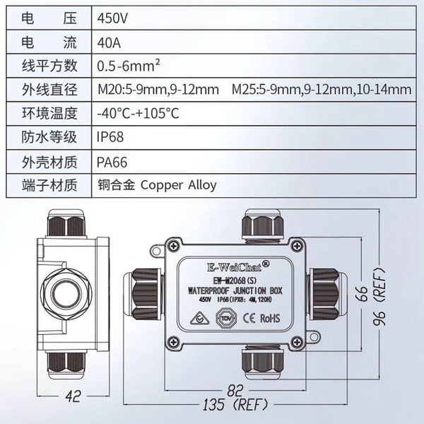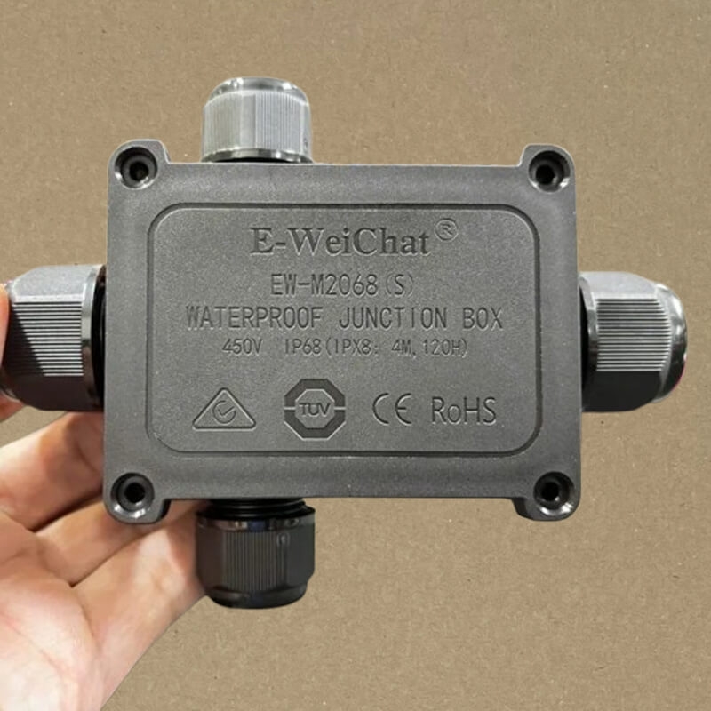 Hộp nối điện chống nước IP68 E-Weichat EW-M2068S-3T là giải pháp kết nối và chia 2,3,4 nhánh dây điện an toàn cho môi trường ngoài trời. Sản phẩm sử dụng nhựa PA66 cao cấp, chịu tải lên đến 40A – 450V, hỗ trợ nhiều đường kính cáp, phù hợp cho hệ thống điện dân dụng và công nghiệp.