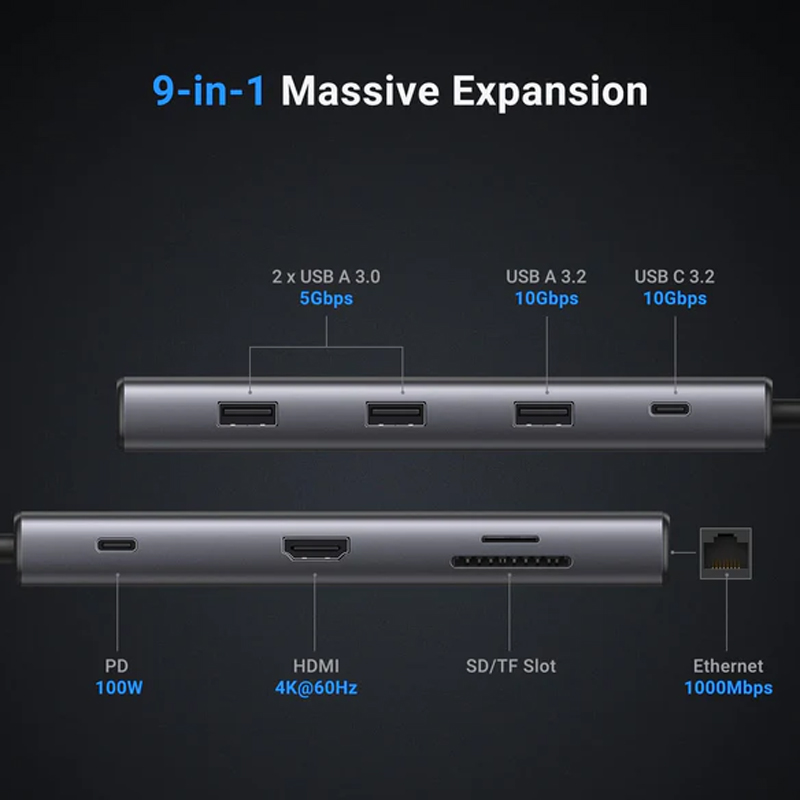 Ugreen 15532 Hub USB-C 9 in 1 USB Type-C to HDMI LAN USB SD/TF Type-C DP 100W CM498